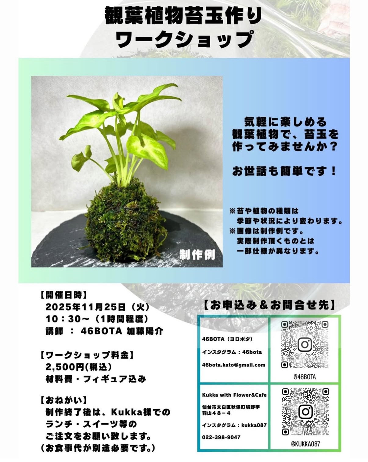 苔テラリウムのワークショップを開催します。 冬でも室内で植物を楽しめる苔盆栽 小さな植木鉢に自分だけの小さな緑の世界を作って見ませんか? 開催日時:11月25日 (金)10:30~ 場所 : Kukkaサンルーム 参加費 : ¥2,500〜(飲食代は別途かかります) ワークショップ終了後、ランチまたはスイーツセットのご注文お願いします。